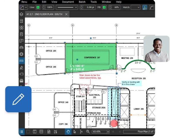 Acelere las revisiones y reduzca el retrabajo invitando a los equipos a revisar, marcar, modificar y actualizar documentos de forma segura al mismo tiempo en el escritorio con Studio en Bluebeam Revu. O comente y colabore en los documentos de su proyecto a través de la web o el móvil utilizando el Editor de marcado en Bluebeam Cloud